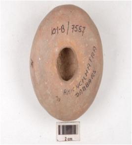 | Description / विवरण | Fragment of a handmade terracotta dabber, circular top with a circular socket at the centre, broken along the neck, surface treated with red slip. |