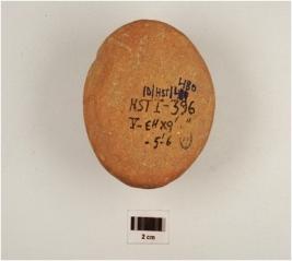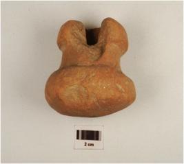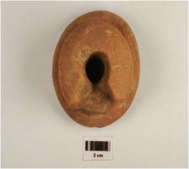 | Description / विवरण | A dabber of red ware, flared circular base, cylindrical profile , flared circular top and partly broken deep hole on top, well baked, medium fabric and surface treated with red slip. |