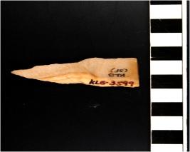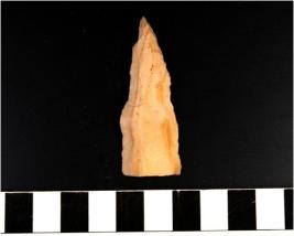 | Description / विवरण | A blade of chert stone having double ridge on the surface, trapezoid cross-section, pointed at one end, sharp cutting edge, triangular in shape. |