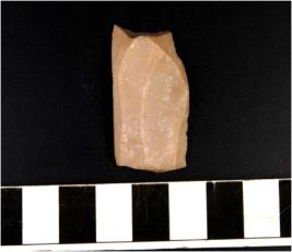 | Description / विवरण | A blade of chert stone having double ridge on the surface, trapezoid cross-section, sharp cutting edge, flat at one end rectangular in shape. |