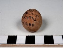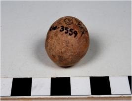 | Description / विवरण | A terracotta sling ball of smooth surface |