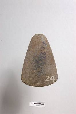 | Description / विवरण | Object is petal shape with little expanded working area. Cutting edge is round and thin. Butt end portion is also round shape. Surface is moderately polished. |