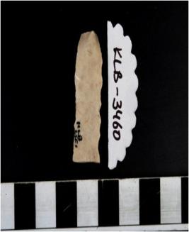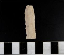 | Description / विवरण | A chert blade with double double ridges, trapezoid cross-section and irregular cutting edge. |