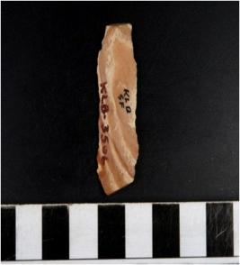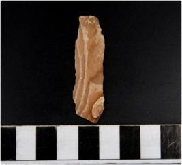 | Description / विवरण | A chert blade with single ridge on dorsal side, sharp cutting edge and bulb on ventral side. |