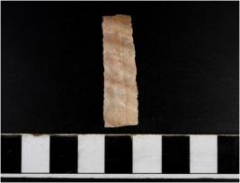 | Description / विवरण | A chert blade with double ridge on dorsal side, trapezoid cross-section and sharp cutting edge. |