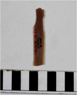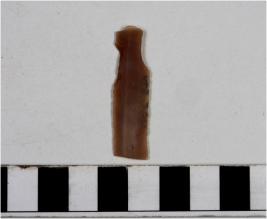 | Description / विवरण | A chert blade with double ridge on dorsal side, trapezoid cross section and sharp cutting edge. |