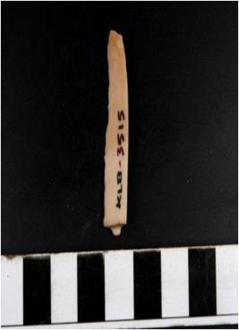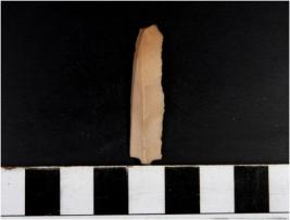 | Description / विवरण | A chert blade with single ridge on dorsal side, triangular cross section, sharp cutting edge and pointed at one end. |