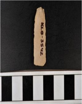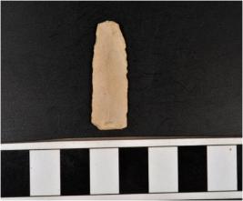 | Description / विवरण | A chert blade with single ridge on dorsal side, triangular cross section, bulb on ventral side and sharp cutting edges. |