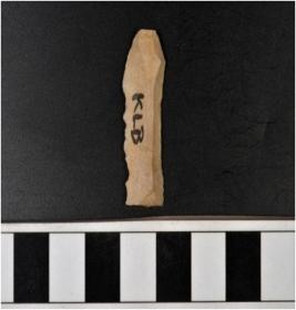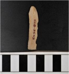 | Description / विवरण | A chert blade with single ridge on dorsal side, triangular cross section, bulb on ventral side and sharp cutting edges. |