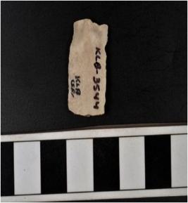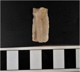 | Description / विवरण | A chert blade with double ridge on dorsal side, trapezoid cross section, bulb on ventral side and sharp cutting edges and broken at one end. |