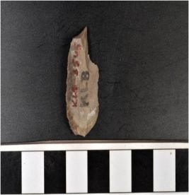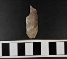 | Description / विवरण | A chert blade with single ridge on dorsal side, triangular cross section, bulb on ventral side and sharp cutting edge. |