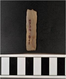 | Description / विवरण | A chert blade with double ridge on dorsal side, trapezoid cross section, sharp cutting edges and both ends broken. |