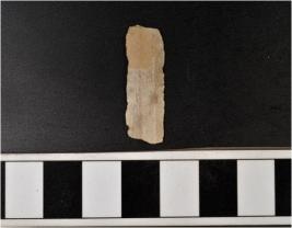 | Description / विवरण | A chert blade with double ridge on dorsal side, trapezoid cross section and sharp cutting edge. |