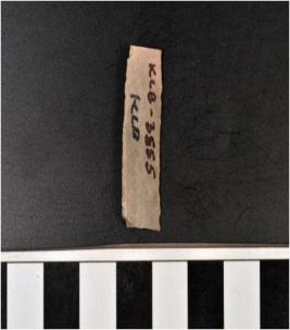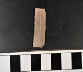 | Description / विवरण | A chert blade with double ridge on dorsal side, trapezoid cross section and sharp cutting edge. |