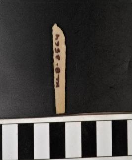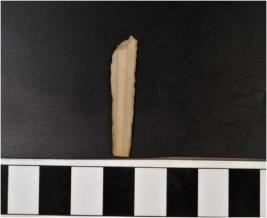 | Description / विवरण | A chert blade with double ridge on dorsal side, trapezoid cross section and sharp working edges. |