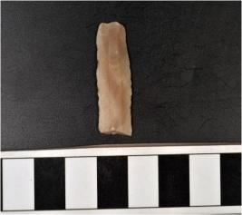 | Description / विवरण | A chert blade with double ridge on dorsal side, trapezoid cross section and sharp cutting edges. |