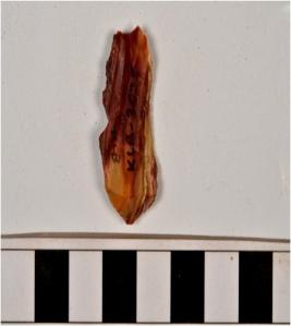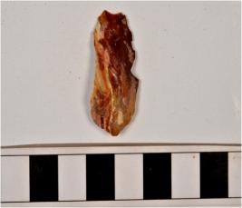 | Description / विवरण | A stone blade with single ridge on dorsal side, triangular cross section and sharp cutting edges. |