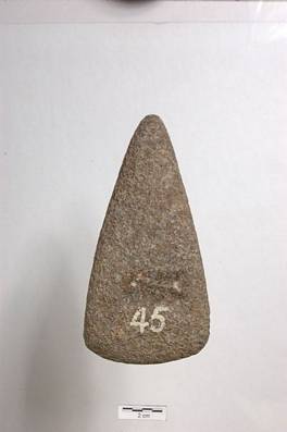 | Description / विवरण | Pear shape object. Cutting edge is straight and butt end area is narrower and pointed. Surface is coarse grain. |