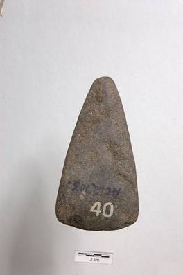 | Description / विवरण | Pear shape object with convex cutting edge and pointed butt end portion. Surface is moderately polished. |