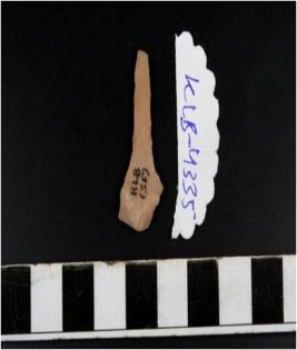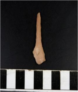 | Description / विवरण | A chert blade with bulb on ventral side and irregular cutting edge. |