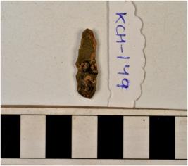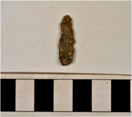 | Description / विवरण | A stone blade with single ridge on dorsal side, triangular cross section, irregular cutting edges and painted at one end. |