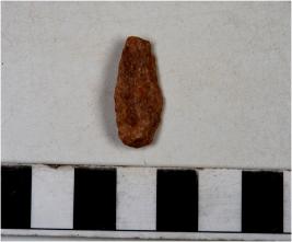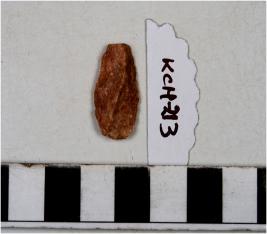 | Description / विवरण | A stone black with single ridge on dorsal side, triangular cross section and blunt cutting edges. |