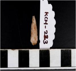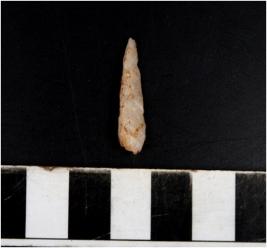 | Description / विवरण | A stone blade with single ridge on dorsal side and bulb on ventral side, triangular cross-section and blunt cutting edges. |