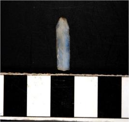 | Description / विवरण | A chalcedony blade with double ridge on dorsal side and bulb on ventral side, trapezoid cross section and sharp cutting edges. |