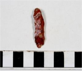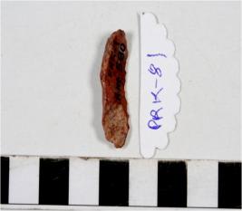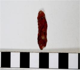 | Description / विवरण | A chert blade with single ridge on the dorsal side and bulb on ventral side, triangular cross section cortex on surface and sharp cutting edges. |