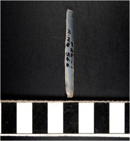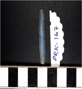 | Description / विवरण | A chalcedony blade with single ridge on dorsal side, bulb on ventral side, triangular cross section and sharp cutting edges. |