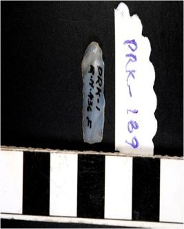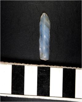 | Description / विवरण | A chalcedony blade with single ridge on dorsal side, bulb on ventral side, triangular cross section and sharp cutting edges. |