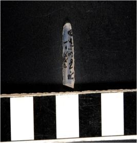 | Description / विवरण | A chalcedony blade with double ridge on dorsal side, trapezoid cross section and sharp cutting edge. |