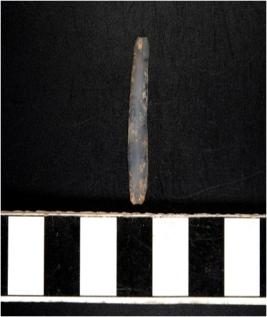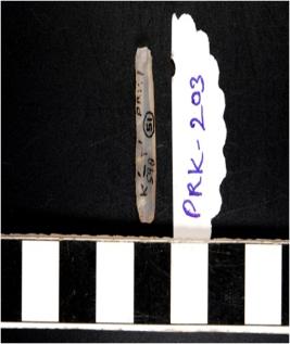 | Description / विवरण | A chalcedony blade with double ridge on dorsal side, trapezoid cross section, bulb on ventral side and sharp cutting edges. |