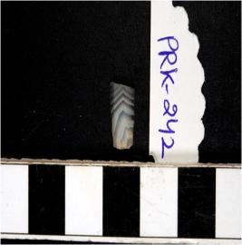 | Description / विवरण | A chert blade with double ridge on dorsal side, trapezoid cross section and sharp cutting edge. |