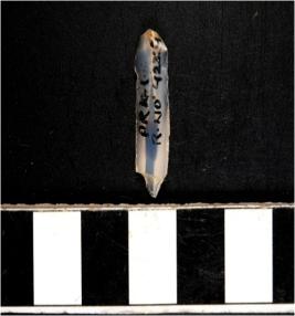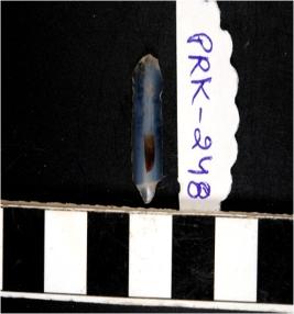 | Description / विवरण | A chalcedony blade with single ridge on dorsal side, triangular cross section sharp cutting edges and bulb on ventral side. |