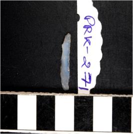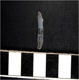 | Description / विवरण | A chalcedony small crescent shaped lunate with blunt straight edge and a sharpened curved cutting edge. |
