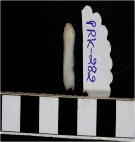 | Description / विवरण | A chert blade with single ridge on dorsal side, triangular cross section, sharp cutting edges, bulb on ventral side and pointed at one end |