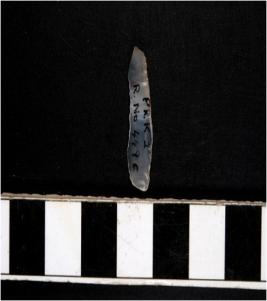 | Description / विवरण | A chalcedony blade with double ridge on dorsal side, trapezoid cross section, use wear marks on cutting edges, bulb on ventral sides and pointed at one end. |