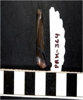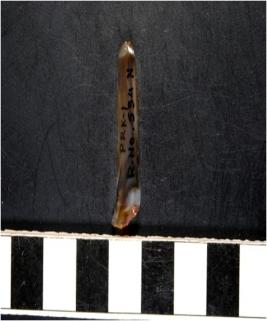 | Description / विवरण | A chalcedony blade with double ridge on dorsal side and bulb on ventral side, trapezoid cross section and sharp cutting edges. |
