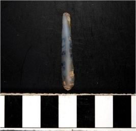| Description / विवरण | A chalcedony blade with single ridge on dorsal side and buld on ventral side triangular cross section and sharp cutting edges. |