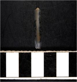 | Description / विवरण | A chalcedony blade with single ridge on dorsal side and bulb on ventral side, triangular cross section and sharp cutting edges. |