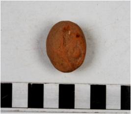 | Description / विवरण | A terracotta sling ball slightly chipped off circular section of smooth surface. |