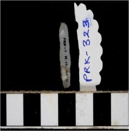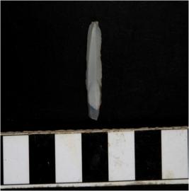 | Description / विवरण | A crecentric blade having both proximal and distal flaking on the upper side with double ridge end of which margin with the upper end having no much retouching with finaly trimmed right side. |