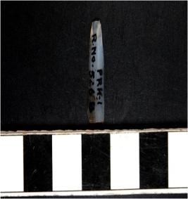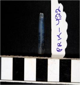 | Description / विवरण | A chalcedony blade with double ridge on dorsal side trapezoid cross section and sharp cutting edges. |