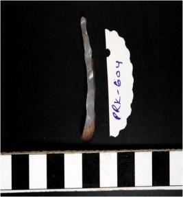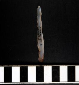 | Description / विवरण | A chalcedony blade with single ridge on dorsal side, triangular cross section, bulb on ventral side, irregular cutting edges and cortex on surface. |
