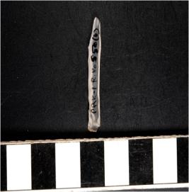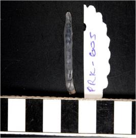 | Description / विवरण | A chalcedony blade with double ridge on dorsal side, trapezoid cross section, bulb on ventral side and sharp cutting edges. |