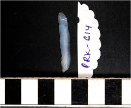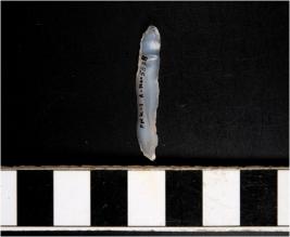 | Description / विवरण | A chalcedony blade with double ridge on dorsal side, trapezoid cross section, bulb on ventral side and sharp cutting edges. |