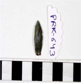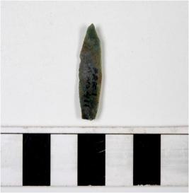 | Description / विवरण | A chert blade with double ridge on dorsal side, trapezoid cross section, bulb on ventral side, sharp cutting edges and pointed at one end. |