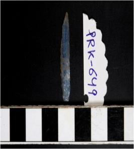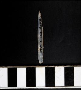 | Description / विवरण | A chalcedony blade with double ridge on dorsal side, trapezoid cross section, sharp cutting edges and pointed at one end. |