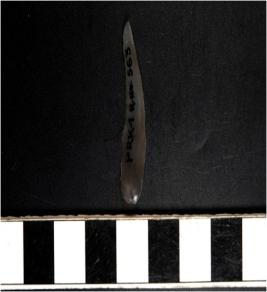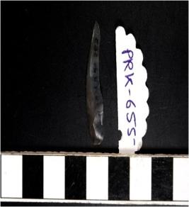 | Description / विवरण | A chalcedony blade with single ridge on dorsal side, triangular cross section, sharp cutting edge and pointed at one end. |